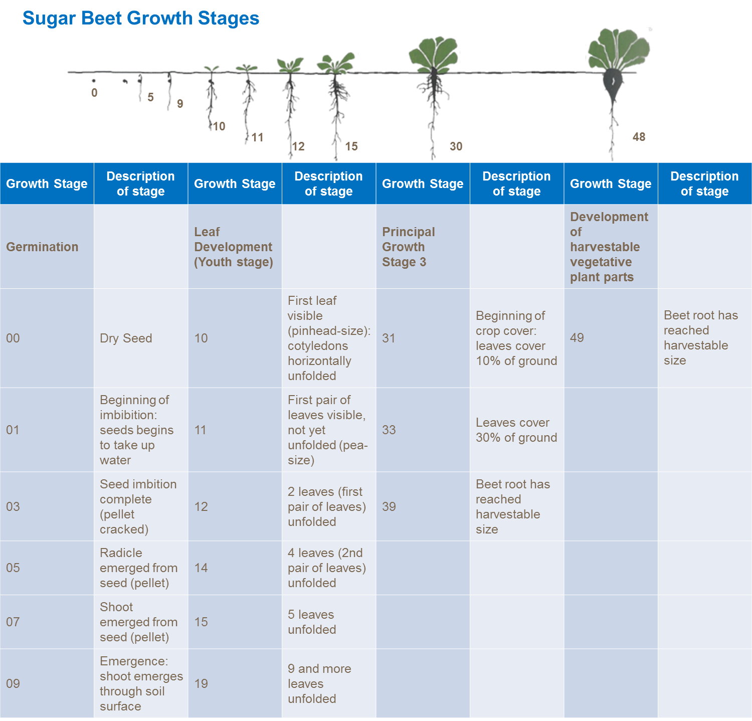 Wzrost roślin buraków cukrowych można opisać bardziej szczegółowo używając skali BBCH. Określa ona szczegółowo poszczególne etapy, fazy wzrostu buraków cukrowych.