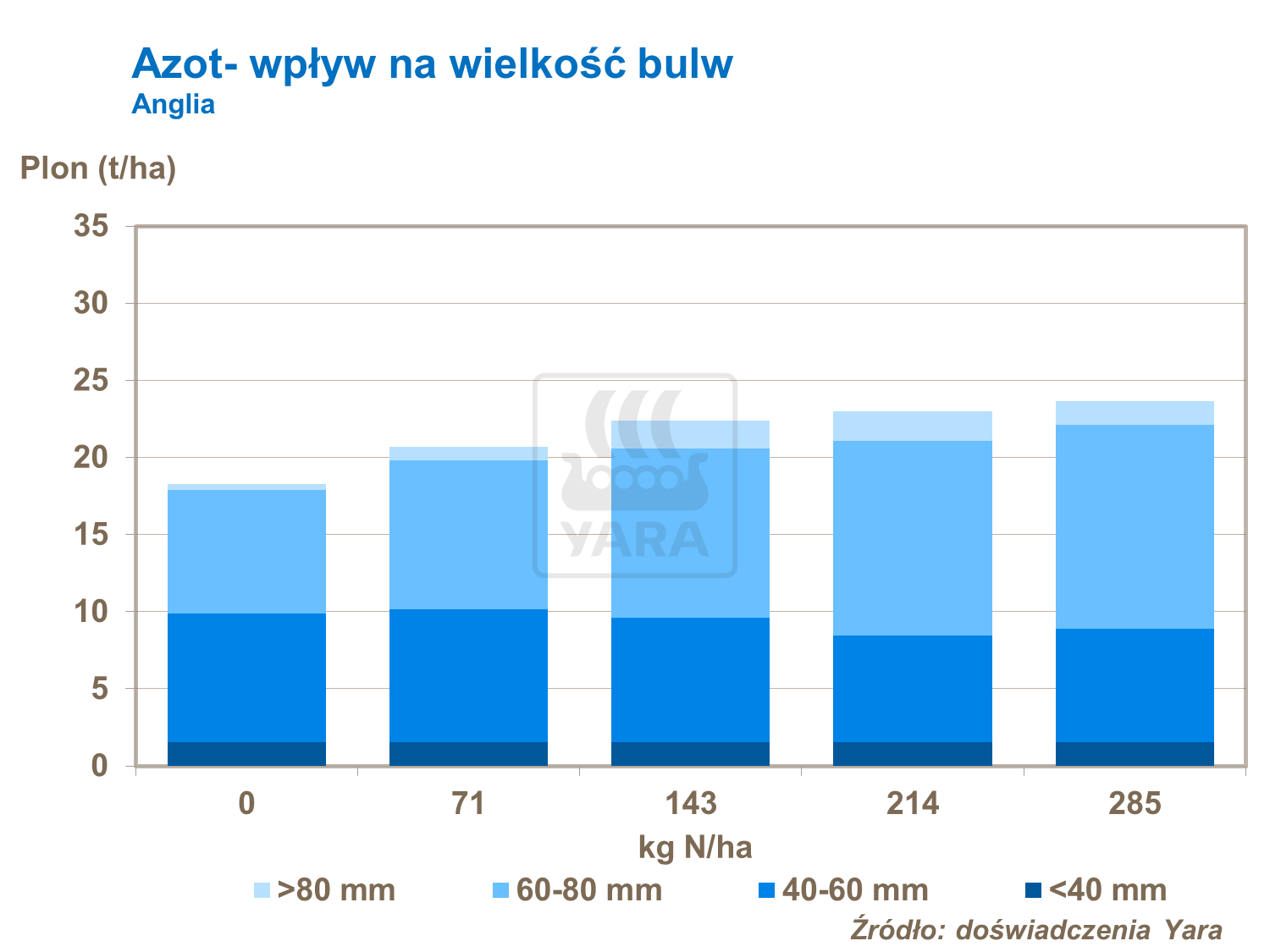 Wieloletnie badania z Anglii wskazują, że wzrastające dawki azotu wpływają na wielkość frakcji bulw a także wielkość plonu ogólnego bulw.