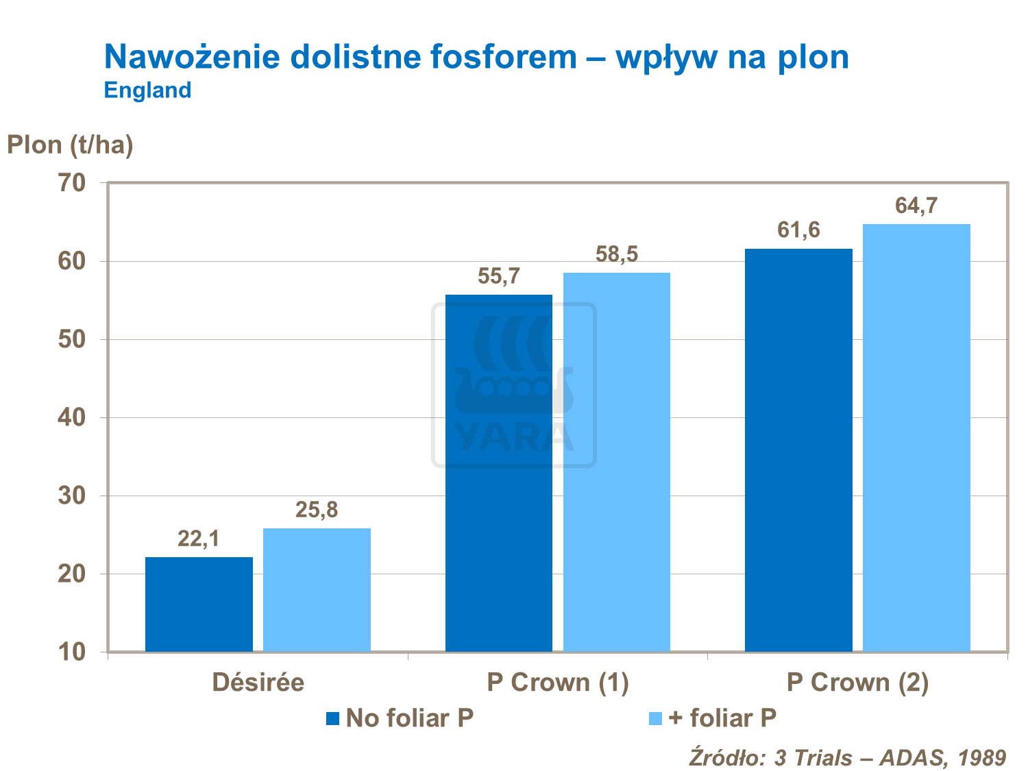 Niezależne doświadczenia prowadzone w Anglii wykazały konsekwentny wzrost plonu przy nawożeniu dolistnym fosforem po tuberyzacji. Nastąpił wzrost udziału frakcji bulw większych oraz plonu całkowitego ziemniaków.