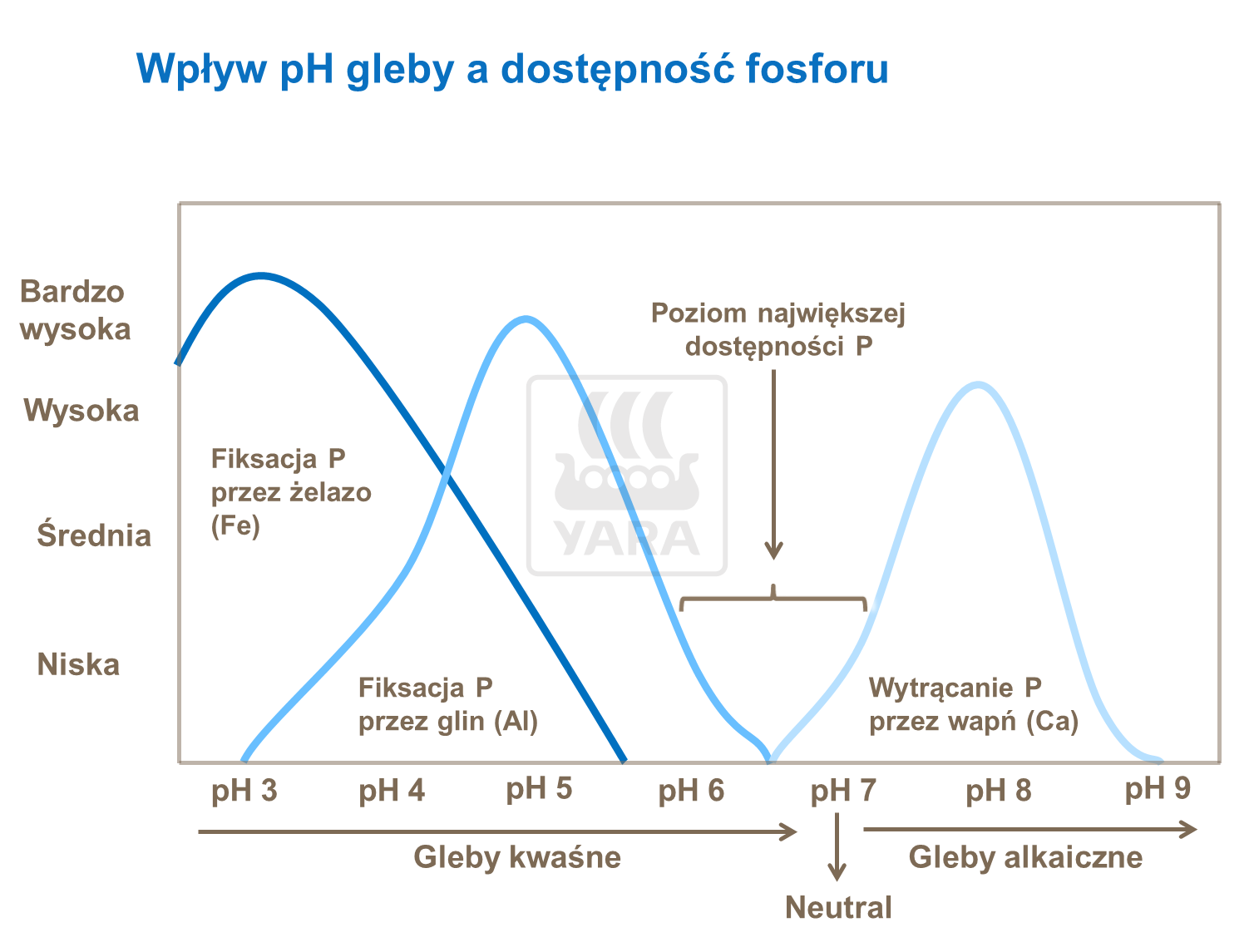 Wykres pokazuje wpływ pH gleby na dostępność fosforu poprzez wyrącenie fosofranów wapnia w wysokim pH i uwstecznianiu przez żelazo i glin w niskim pH.